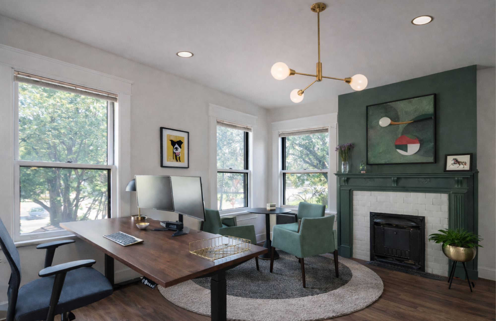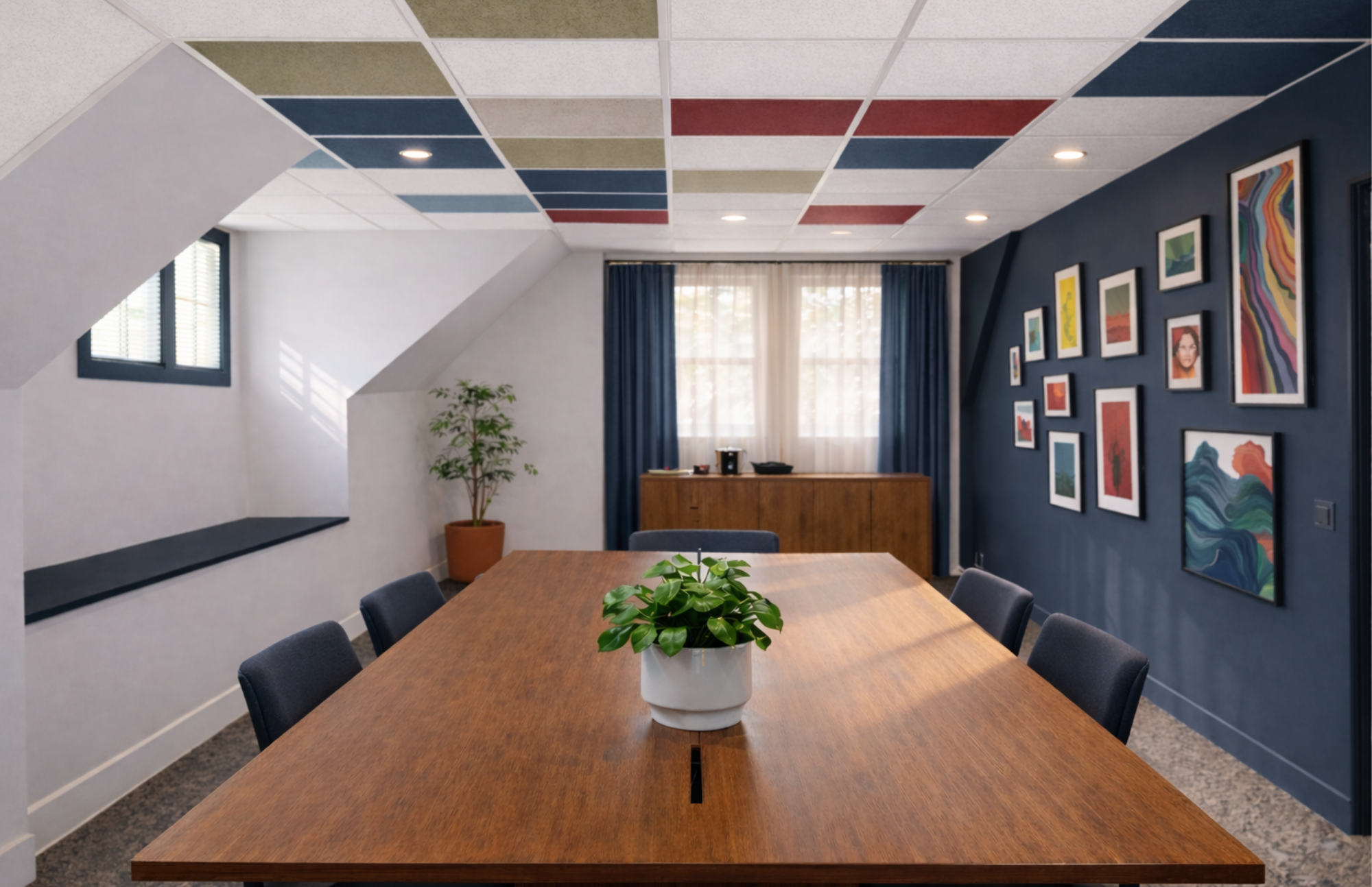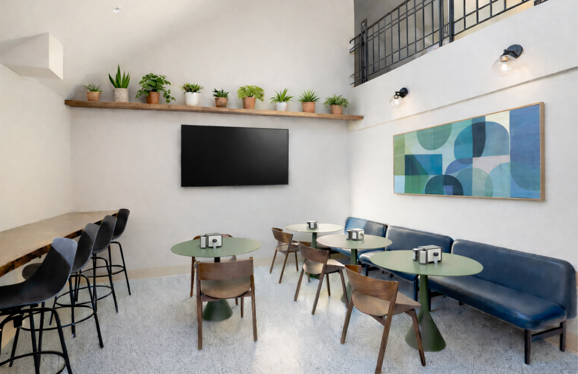 This renovation serves as the epicenter for Park Center, Inc.'s multifaceted programming and services, featuring versatile conference rooms, a welcoming coffee bar, captivating ceiling murals, a "history wall," and a coworking space.